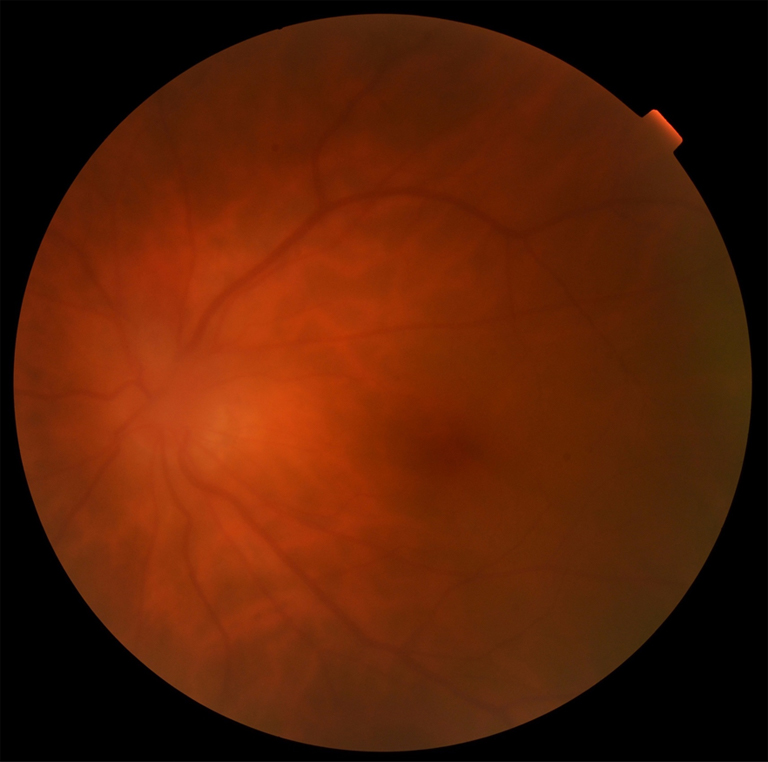 ベーチェット病による硝子体混濁がある目の眼底写真。