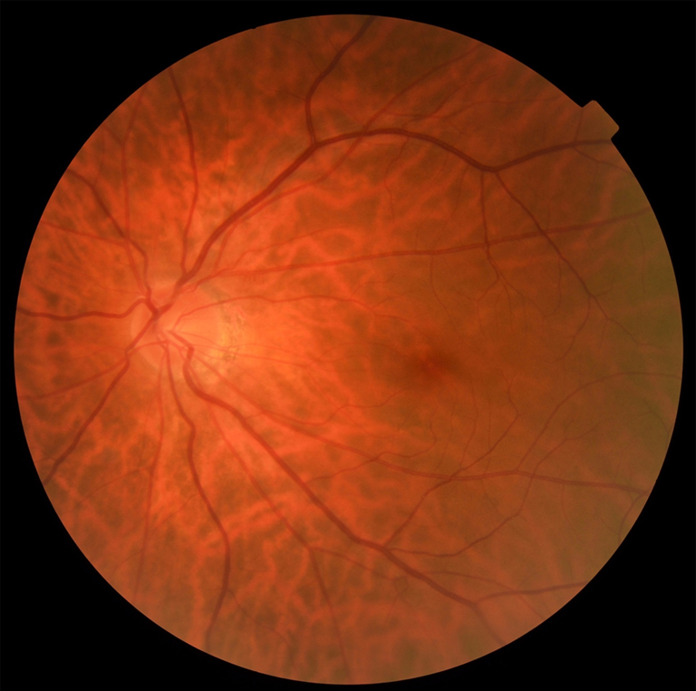 治療後の眼底写真。眼底の網膜血管がきれいに確認できます。進行した緑内障や急性緑内障発作でも視力低下をきたします。症状の改善や進行予防には薬物治療や手術治療が必要となります。